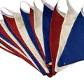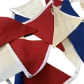 Vintage British Teatime Bunting Add a touch of nostalgic charm to your gathering with our vintage-style British teatime bunting. Featuring classic red, white, and blue cotton flags, this charming decoration evokes the timeless elegance of traditional British garden parties and afternoon tea. The cotton has been over-stained with tanning (tea!) to create an aged, vintage look while being new and robust to last time and time again. Created with 100% cotton, it's perfect for patriotic celebrations, summer fêtes, or simply adding a delightful, classic flourish to your home or garden. This is a long 3.8 metre length of bunting plus ties (that's about 12.5 feet). Each flag is 15 cm wide, 20cm long and has 5cm gap between flags. There are 18 flags in total. 100% cotton, wash and iron as cotton